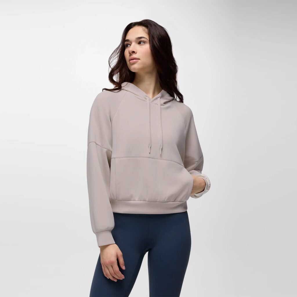 The Shea Hoodie by PrAna is perfect. It’s buttery soft, lightweight, loose-fitting, has a drawstring hood, has a kangaroo pocket, and comes in 3 colors. I have it in Deep Vino. It’s so pretty and very flattering.